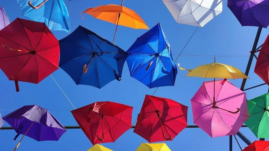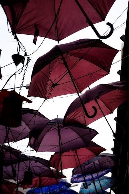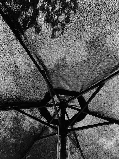 This shield safeguards against dust, dirt, UV rays, and moisture, preventing fading and material degradation. Ensure the canopy is dry before covering to avoid mildew. Secure the cover tightly to resist wind uplift. Regular use of the protective cover, as outlined in the manual, significantly extends the umbrella’s lifespan and maintains its aesthetic appeal.